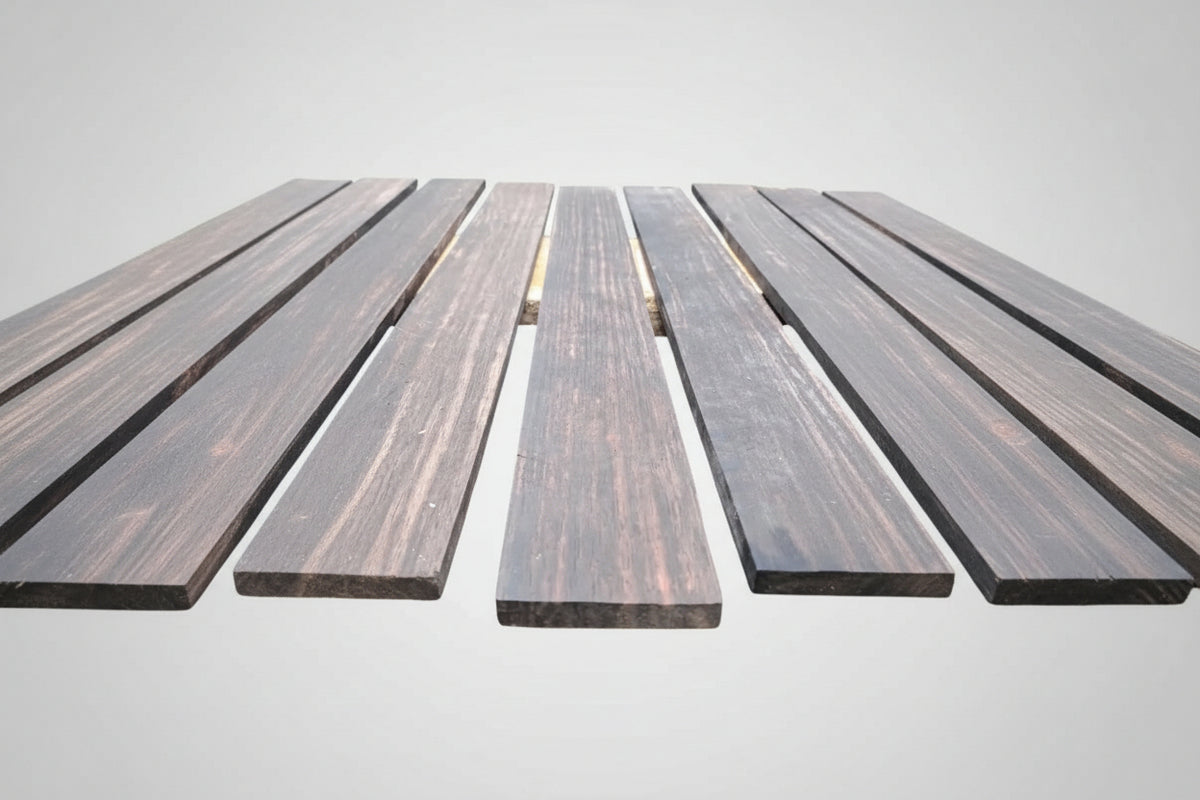 Known for its dramatic natural striping, this ebony species features deep brown to black tones highlighted by warm golden and reddish streaks. The fine, dense grain allows for accurate fret slotting, clean shaping, and a glass-smooth finish—ideal for both concert-grade ukuleles and custom builds.